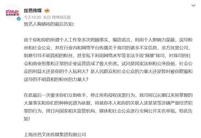 丝芭传媒在声明中火药味十足,措辞严厉。其公开谴责鞠婧祎及其工作室长久以来“编造谎言、误导公众”,甚至指控对方借助网络水军对公司发起大规模的“网络暴力”,这一行为严重损害了企业的声誉与形象。 声明中,丝芭传媒以极为严肃的口吻发出质问,强调个人私利绝不应凌驾于国家法制与社会公众利益之上。除了要求鞠婧祎“立刻收手”之外,丝芭传媒还对下一步行动作出了预告。 声明明确指出,倘若鞠婧祎一方拒绝停止侵权与抹黑行为,公司将正式向监管机构及公众进行实名举报,指控鞠婧祎及其关联人涂某某涉嫌严重经济犯罪。
